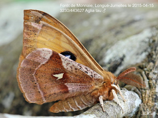 SATURNIIDAE, Agliinae, Aglia tau (Linnaeus, 1758)_3230/443627 la Hachette (mâle)_Forêt de Monnaie, Longué-Jumelles le 2015-04-15_Ident : JPC