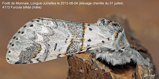NOTODONTIDAE, Notodontinae, Dicranurini, Furcula bifida (Brahm, 1787) (= Harpya)_4173/446473 la Petite Queue Fourchue, la Dicranoure bifide_Forêt de Monnaie, Longué-Jumelles le 2012-08-04 (élevage chenille du 01 juillet)_Ident : JPC