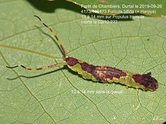 NOTODONTIDAE, Notodontinae, Dicranurini, Furcula bifida (Brahm, 1787) (= Harpya)_4173/446473 chenille de la Petite Queue Fourchue, la Dicranoure bifide_Forêt de Chambiers, Durtal le 2019-09-26 ( 13 à 14 mm sur Populus tremula, morte le 02/10)_Ident : JPC