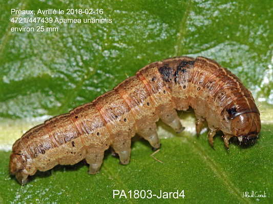 NOCTUIDAE, Noctuinae, Apameini, Apamea unanimis (Hübner, 1813)_4721/447439 chenille de la Noctuelle de l'alpiste_Préaux, Avrillé le 2018-02-16 (environ 25 mm)_Ident : JPC PA1803