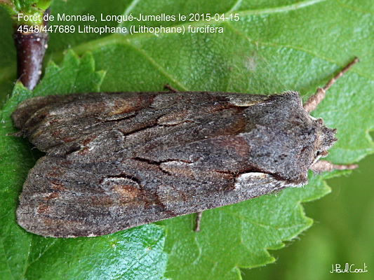 NOCTUIDAE, Noctuinae, Xylenini, Lithophane (Lithophane) furcifera (Hufnagel, 1766)_4548/447689 la Xyline du bouleau_Forêt de Monnaie, Longué-Jumelles le 2015-04-15_Ident : JPC