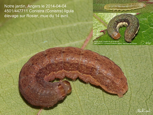 NOCTUIDAE, Noctuinae, Xylenini, Conistra (Conistra) ligula (Esper, 1791)_4501/447711 chenille de l' Orrhodie ligulée_Notre jardin, Angers le 2014-04-04 (mue du 14 avril)_Ident : JPC