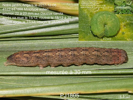 NOCTUIDAE, Noctuinae, Xylenini, Mniotype solieri (Boisduval, 1829)_4522/447888 chenille de la Xyline provençale sur Daucus carota_Notre jardin, Angers le 2017-12-08 (environ 22 à 23 mm, après sa mue le 15/12, rousse à 30 mm le 18/12, cocon après le 27/12, imago le 28/09/2018)_Ident : JPC PJ1805