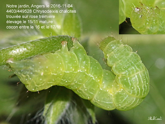 NOCTUIDAE, Plusiinae, Argyrogrammatini, Chrysodeixis chalcites (Esper, 1789)_4403/449528 la Plusie chalcite sur rose trémière_Notre jardin, Angers le 2016-11-04 (élevage le 15/11 mature)_Ident : JPC