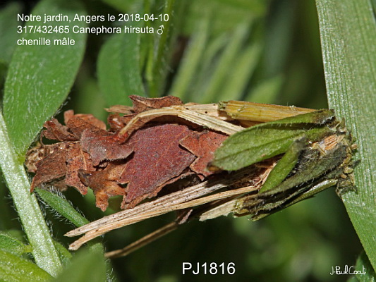 PSYCHIDAE, Oiketicinae, Acanthopsychini, Canephora hirsuta (Poda, 1761) [= C unicolor (Hufnagel, 1766)]_317/432465 chenille mâle de la Psyché du gramen_Notre jardin, Angers le 2018-04-10_Ident : JPC PJ1816