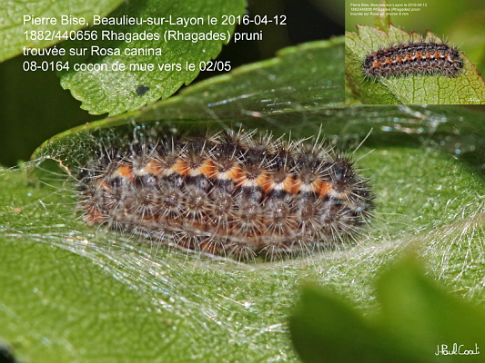 | ZYGAENIDAE, Procridinae, Procridini, Rhagades (Rhagades) pruni (D & S, 1775)_1882/440656 chenille du Procris du prunellier sur Rosa canina_Pierre Bise, Beaulieu-sur-Layon le 2016-04-12 (cocon de mue vers le 02/05)_Ident : JPC |