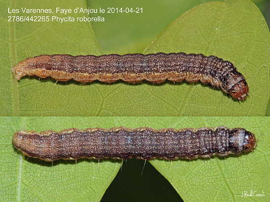 PYRALIDAE, Phycitinae, Phycitini, Phycita roborella (D & S, 1775)_2786/442265 chenille_Les Varennes, Faye d’Anjou le 2014-04-21_ident : JPC