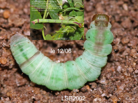 GEOMETRIDAE, Larentiinae, Larentiini, Anticlea derivata (D & S, 1775)_3727/445007 chenille de la Cidarie dérivée, la Violette_les Sablières d'Ecouflant le 2019-05-30 (en mue à 18 à 20 mm sur Rosa canina, 20 mm après mue le 31/05, 30 mm le 04/06, pré-nymphose sur le sol le 09/06, photo le 12/06, chrysalide 1er jour le 15/06, avortée)_Ident : JPC LSE2002