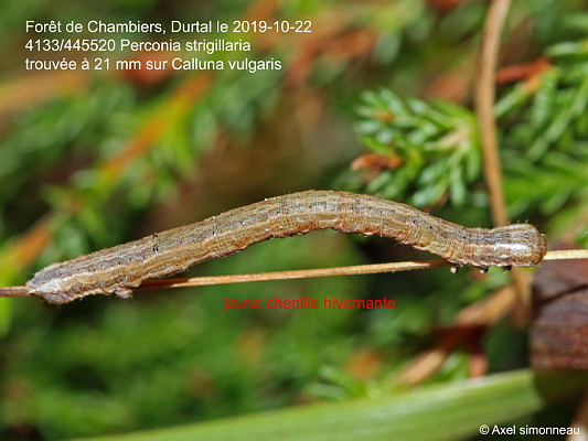 GEOMETRIDAE, Ennominae, Aspitatini, Perconia strigillaria (Hübner, 1819)_4133/445520 jeune chenille hivernante de l'Etrille, la Phalène strigillée_Forêt de Chambiers, Durtal le 2019-10-22 (trouvée à 21 mm sur Calluna vulgaris)_Ident : JPC (Axel Simonneau)