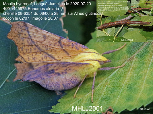 GEOMETRIDAE, Ennominae, Ennomini, Ennomos alniaria (Linnaeus, 1758)_4001/445975 l'Ennomos du tilleul femelle_Moulin hydronef, Longué-Jumelles le 2020-07-20 (chenille 08-6351 du 08/06 à 28 mm sur Alnus glutinosa, cocon le 02/07, imago le 20/07)_Ident : JPC MHLJ2001