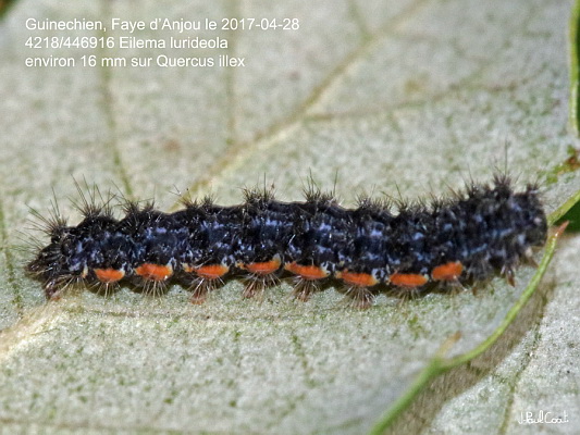 EREBIDAE, Arctiinae, Lithosiini, Eilema lurideola (Zincken, 1817)_4218/446916 chenille de la Lithosie complanule, la Lithosie plombée_Guinechien, Faye d’Anjou le 2017-04-28 (environ 16 mm sur Quercus illex)_Ident : JPC
