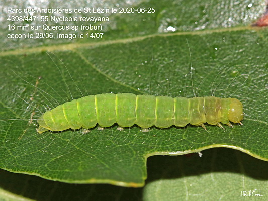 NOLIDAE, Chloephorinae, Sarrothripini, Nycteola revayana (Scopoli, 1772)_4398/447155 chenille de la Sarrothripe de Revay_Parc des Ardoisières de St Lézin le 2020-06-25 (trouvée à 16 mm sur Quercus sp, cocon le 29/06, imago le 14/07)_Ident JPC