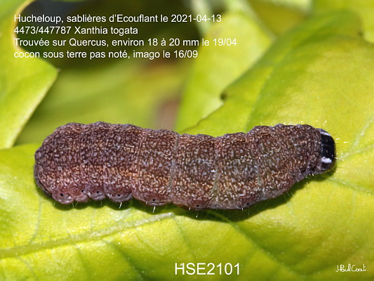NOCTUIDAE, Noctuinae, Xylenini, Xanthia togata (Esper, 1788)_4473/447787 chenille de la Mantelée, la Xanthie ochracée_Hucheloup, sablières d'Ecouflant le 2021-04-13 (trouvée sur Quercus, environ 18 à 20 mm le 19/04, cocon sous terre pas noté, imago le 16/09)_Ident : JPC HSE2101