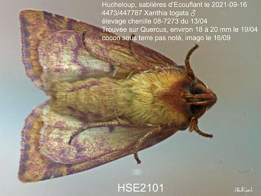 NOCTUIDAE, Noctuinae, Xylenini, Xanthia togata (Esper, 1788)_4473/447787 la Mantelée, la Xanthie ochracée mâle_Hucheloup, sablières d'Ecouflant le 2021-09-16 (chenille 08-7273 du 13/04 trouvée sur Quercus, environ 18 à 20 mm le 19/04, cocon sous terre pas noté, imago le 16/09)_Ident : JPC HSE2101