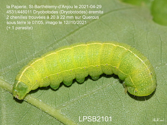 NOCTUIDAE, Noctuinae, Xylenini, Dryobotodes (Dryobotodes) eremita (Fabricius, 1775)_4531/448011 chenille du Jaspe vert_la Paperie, St-Barthélemy-d’Anjou le 2021-04-29 (2 chenilles à 20 à 22 mm sur quercus, sous terre le 07/05, un parasite + une chrysalide, imago le 12/10)_Ident : JPC LPSB2101