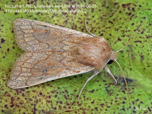 NOCTUIDAE, Noctuinae, Leucaniini, Mythimna (Mythimna) vitellina (Hübner, 1808)_4791/448386 la Leucanie vitelline_Nocturne CPIE, Chalonnes-sur-Loire le 2016-06-25_Ident : JPC