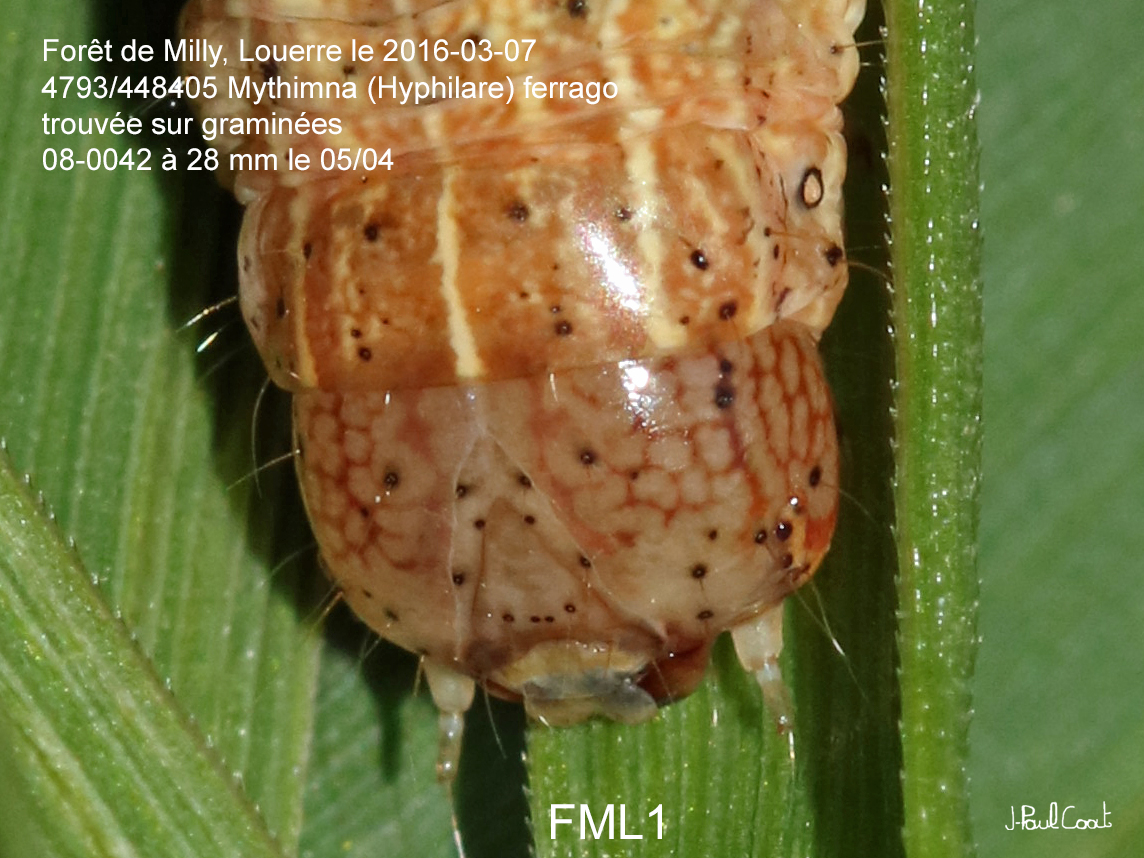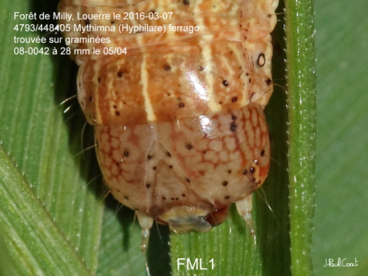 NOCTUIDAE, Noctuinae, Leucaniini, Mythimna (Hyphilare) ferrago (Fabricius, 1787)_4793/448405 chenille de la Noctuelle lythargyrée_Forêt de Milly, Louerre le 2016-03-07 (08-0042 à 28 mm le 05/04)_Ident : JPC FML1