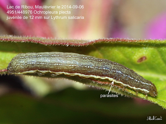 NOCTUIDAE, Noctuinae, Noctuini, Ochropleura plecta (Linnaeus, 1758)_4951/448976 juvénile 12 mm du Cordon blanc sur Lythrum salicaria_Lac de Ribou, Maulévrier le 2014-09-06_Ident : JPC