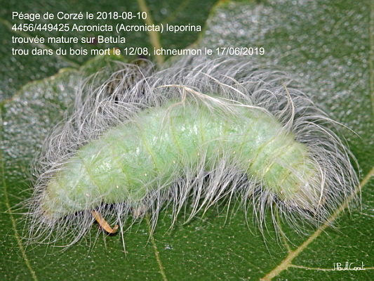 NOCTUIDAE, Acronictinae, Acronicta (Acronicta) leporina (Linnaeus, 1758)_4456/449425 chenille de la Noctuelle-Lièvre_Péage de Corzé le 2018-08-10 (mature sur Betula, trou dans du bois mort le 12/08, ichneumon le 17/06/2019)_Ident : JPC