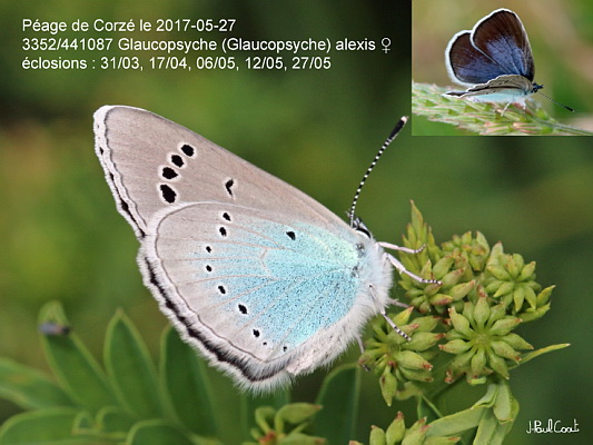 LYCAENIDAE, Polyommatinae, Polyommatini, Glaucopsyche (Glaucopsyche) alexis (Poda, 1761)_3352/441087 l'Azuré des cytises (femelle)_Péage de Corzé le 2017-05-27 (chrysalides 08-1275 du 2016-06-30)_Ident : JPC