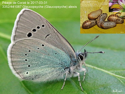 LYCAENIDAE, Polyommatinae, Polyommatini, Glaucopsyche (Glaucopsyche) alexis (Poda, 1761)_3352/441087 l'Azuré des cytises (femelle)_Péage de Corzé le 2017-03-31 (chrysalides 08-1275 du 2016-06-30)_Ident : JPC