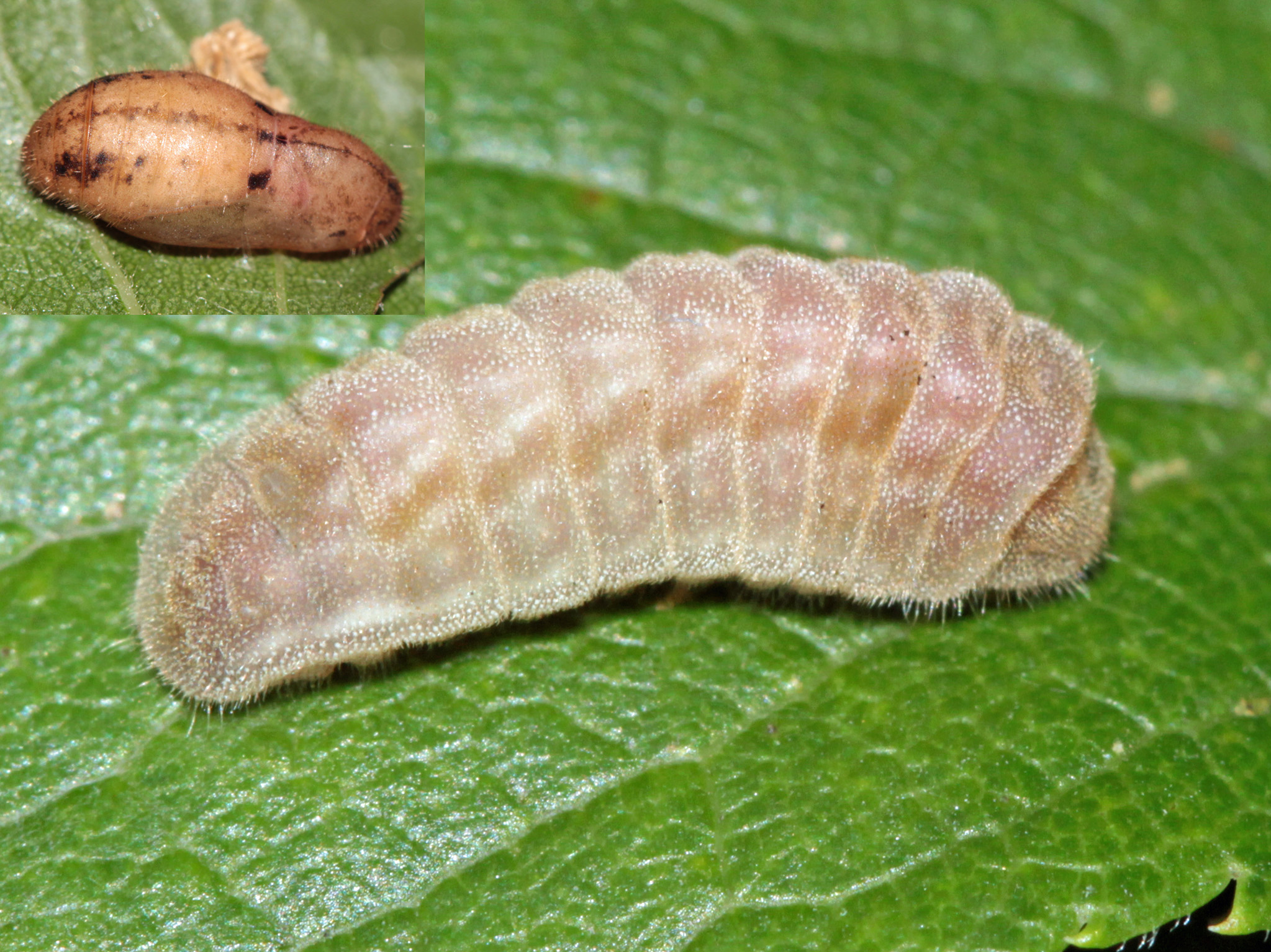 LYCAENIDAE, Polyommatinae, Polyommatini, Celastrina argiolus (Linnaeus, 1758)_3351/441106 chenille de l' Azuré des nerpruns, l' Argus à bande noire_St-Lézin, Trélazé le 2014-07-12 (chenille 07-2938 trouvée sur Prunus spinosa (couleurs de pré-nymphose) le 12/07, nymphose vers le 14 ou 15 juillet)_Ident :JPC