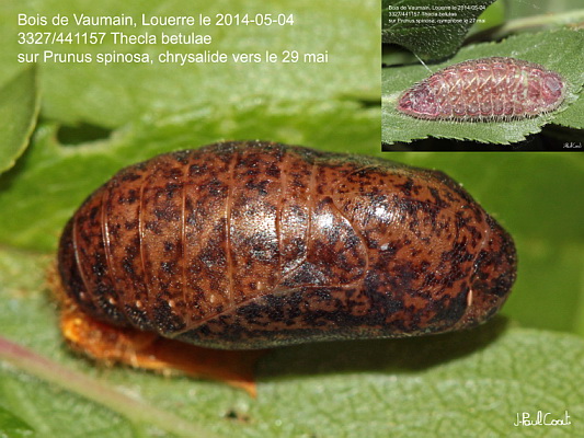 LYCAENIDAE, Theclinae, Theclini, Thecla betulae (Linnaeus, 1758)_3327/441157 chrysalide de la Thécla du bouleau sur Prunus spinosa_Bois de Vaumain, Louerre le 2014-05-04 (chrysalide vers le 29 mai)_Ident : JPC