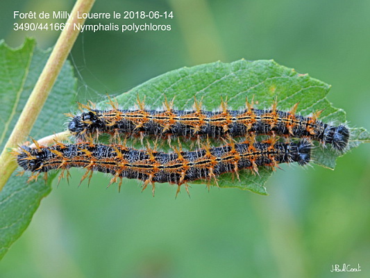 NYMPHALIDAE, Nymphalinae, Nymphalini, Nymphalis polychloros (Linnaeus, 1758)_3490/441667 chenille de la Grande tortue_Forêt de Milly, Louerre le 2018-06-14_Ident : JPC