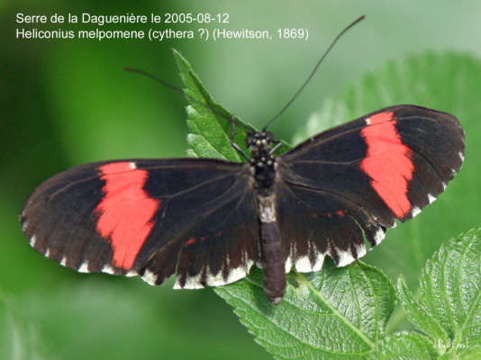 NYMPHALIDAE, Heliconiinae, Heliconius melpomene (cythera ?) (Hewitson, 1869)_Amérique du sud et centrale_Serre de la Daguenière le 2005-08-12