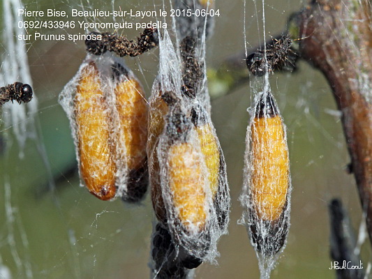 YPONOMEUTIDAE, Yponomeutinae, Yponomeuta sp (padella) (Linnaeus, 1758)_692/433946 chrysalides sur Prunus spinosa_Pierre Bise, Beaulieu-sur-Layon le 2015-06-04_Ident : JPC