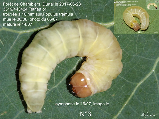 DREPANIDAE, Thyatirinae, Tethea or (D & S, 1775)_3519/443424 chenille de l’Or, la Double-Bande brune sur Populus tremula_Forêt de Chambiers, Durtal le 2017-06-23 (10 mm le 23/06, mue le 30/06, photo du 06/07, mature 2 jours avant nymphose le 16/07, imago le )_Ident : JPC N°3