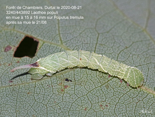 SPHINGIDAE, Smerinthinae, Smerinthini, Laothoe populi (Linnaeus, 1758)_3240/443892 chenille du Sphinx du peuplier_Forêt de Chambiers, Durtal le 2020-08-21 (en mue à 15 à 16 mm sur Populus tremula, après sa mue le 21/08)_Ident : JPC