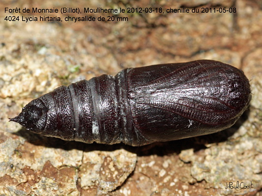 GEOMETRIDAE, Ennominae, Bistonini, Lycia hirtaria (Clerck, 1759)_4024/445623 chrysalide de la Phalène hérissée_Forêt de Monnaie (Billot), Mouliherne le 2012-03-18 (chenille du 2011-05-08)_Ident : JPC