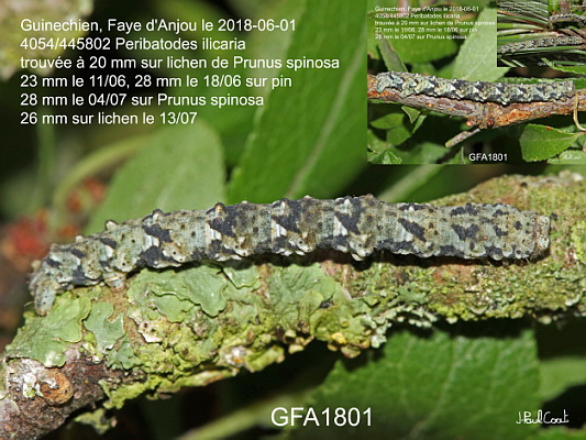 GEOMETRIDAE, Ennominae, Boarmiini, Peribatodes ilicaria (Geyer, 1833)_4054/445802 chenille de la Boarmie de l'Yeuse_Guinechien, Faye d'Anjou le 2018-06-01 (20 mm sur lichen de Prunus spinosa, 23 mm le 11/06, 28 mm le 18/06, 28 mm le 04/07, idem 26 mm sur lichen le 13/07)_Ident JPC GFA1801