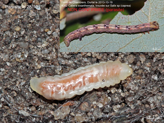 GEOMETRIDAE, Ennominae, Caberini, Cabera exanthemata (Scopoli, 1763)_4082/445923 parasite de la Cabère pustulée sur Salix sp (caprea)_Forêt de Chambiers, Durtal le 2013-10-19 (parasite le 28/10)_Ident : JPC
