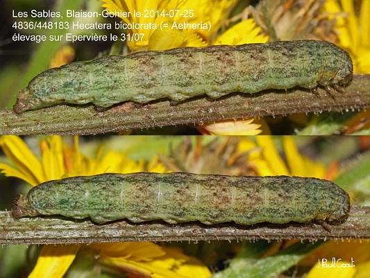 NOCTUIDAE, Noctuinae, Hadenini, Hecatera bicolorata (Hufnagel, 1766) (= Aetheria)_4836/448183 chenille de la Noctuelle sereine_Les Sables, Blaison-Gohier le 2014-07-25 (le 31/07 sur Epervière)_Ident : JPC