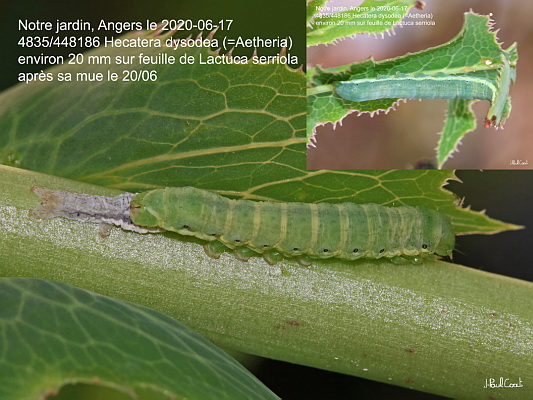 NOCTUIDAE, Noctuinae, Hadenini, Hecatera dysodea (D & S, 1775) (=Aetheria)_4835/448186 chenille de la Noctuelle dysodée_Notre jardin, Angers le 2020-06-17 (environ 20 mm sur feuille de Lactuca serriola, après sa mue le 20/06)_Ident : JPC
