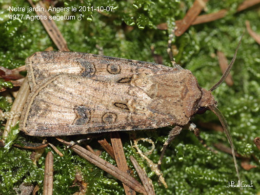 NOCTUIDAE, Noctuinae, Noctuini, Agrotis segetum (D & S, 1775)_4977/448472 la Noctuelle des moissons (mâle)_Notre jardin, Angers le 2011-10-07_Ident : JPC