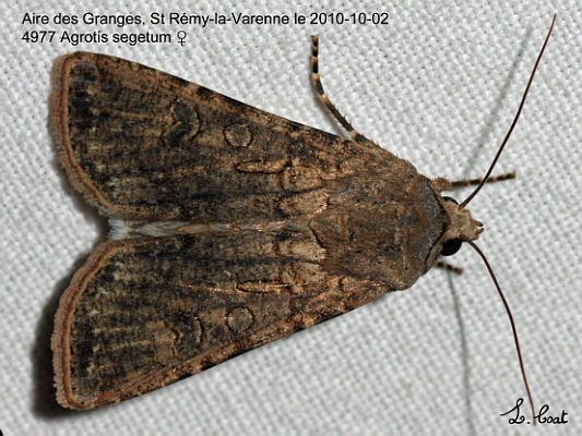 NOCTUIDAE, Noctuinae, Noctuini, Agrotis segetum (D & S, 1775)_4977/448472 la Noctuelle des moissons (femelle)_Aire des Granges, St Rémy-la-Varenne le 2010-10-02_Ident : Bruno Lambert