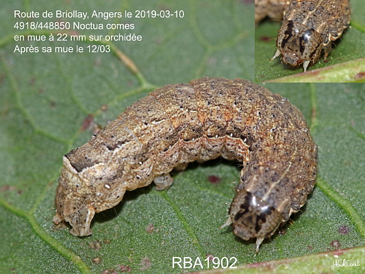 NOCTUIDAE, Noctuinae, Noctuini, Noctua comes (Hübner, 1813)_4918/448850 chenille de la Hulotte_Route de Briollay, Angers le 2019-03-10 (en mue à 22 mm sur orchidée, après sa mue le 12/03)_Ident : JPC RBA1902