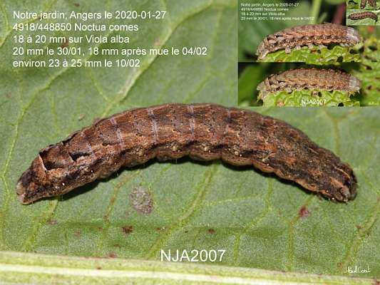 NOCTUIDAE, Noctuinae, Noctuini, Noctua comes (Hübner, 1813)_4918/448850 chenille de la Hulotte_Notre jardin, Angers le 2020-01-27 (18 à 20 mm sur Viola alba, 20 mm le 30/01, 18 mm après mue le 04/02, environ 23 à 25 mm le 10/02)_Ident : JPC NJA2007