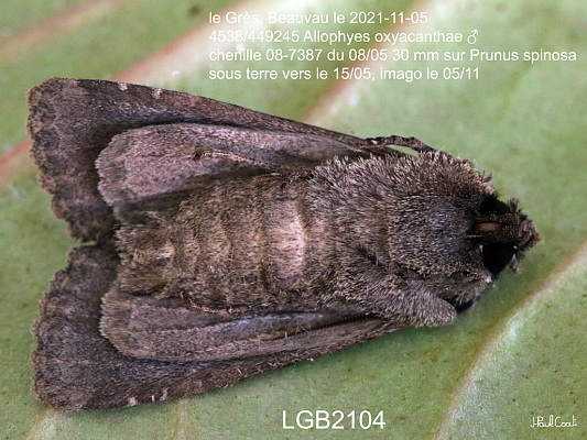 NOCTUIDAE, Amphipyrinae, Psaphidini, Allophyes oxyacanthae (Linnaeus, 1758)_4538/449245 l' Aubépinière mâle_le Grès, Beauvau le 2021-11-05 (chenille 08-7387 le 08/05 30 mm sur Prunus spinosa, sous terre vers le 15/05, imago le 05/11/2021)_Ident : JPC LGB2104