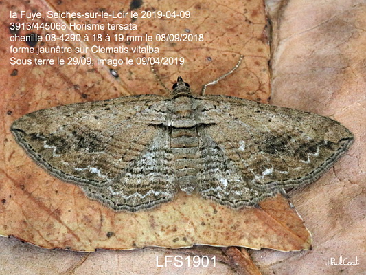 GEOMETRIDAE, Larentiinae, Melanthiini, Horisme tersata (D & S, 1775)_3913/445068 l'Horisme élégant, l'Essuyée_la Fuye, Seiches-sur-le-Loir le 2019-04-09 (chenille 08-4290 forme jaunâtre à 18 à 19 mm le 08/09 sur Clematis vitalba, sous terre le 29/09, imago le 09/04/2019)_Ident : JPC LFS1901