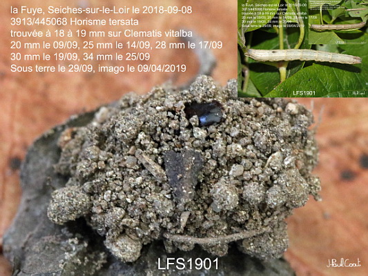 GEOMETRIDAE, Larentiinae, Melanthiini, Horisme tersata (D & S, 1775)_3913/445068 cocon de l'Horisme élégant, l'Essuyée_la Fuye, Seiches-sur-le-Loir le 2018-09-08 (trouvée à 18 à 19 mm sur Clematis vitalba, 20 mm le 09/09, 25 mm le 14/09, 28 mm le 17/09, 30 mm le 19/09, 34 mm le 25/09, 30 mm le 28/09, sous terre le 29/09, imago le 09/04/2019)_Ident : JPC LFS1901