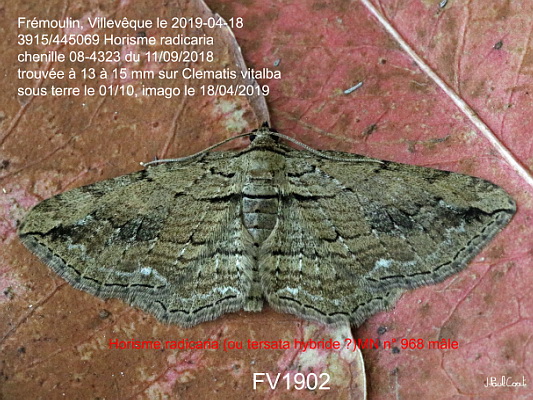 GEOMETRIDAE, Larentiinae, Melanthiini, Horisme radicaria (de La Harpe, 1855)_3915/445069 l'Horisme jumeau_Frémoulin, Villevêque le 2019-04-18 (chenille 08-4323 du 11/09/2018 trouvée à 13 à 15 mm sur Clematis vitalba, sous terre le 01/10, imago le 18/04)_Ident : JPC FV1902