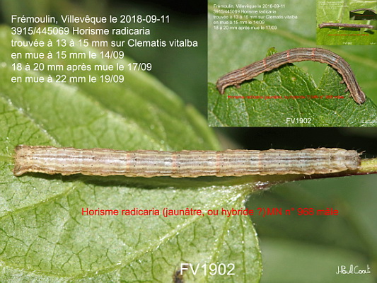 GEOMETRIDAE, Larentiinae, Melanthiini, Horisme radicaria (de La Harpe, 1855)_3915/445069 chenille de l'Horisme jumeau_Frémoulin, Villevêque le 2018-09-11 (trouvée à 13 à 15 mm sur Clematis vitalba, en mue à 15 mm le 14/09, 18 à 20 mm après mue le 17/09, en mue à 22 mm le 19/09)_Ident : JPC FV1902