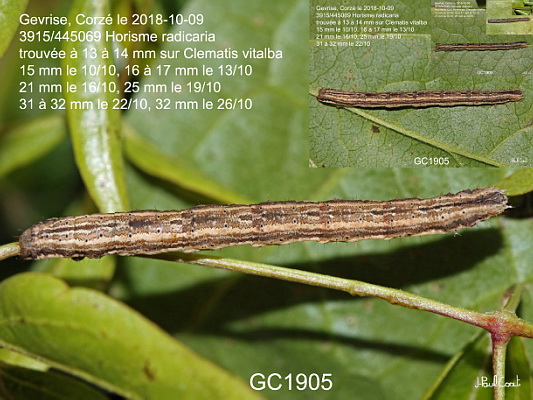 GEOMETRIDAE, Larentiinae, Melanthiini, Horisme radicaria (de La Harpe, 1855)_3915/445069 chenille de l'Horisme jumeau_Gevrise, Corzé le 2018-10-09 (13 à 14 mm sur Clematis vitalba, 15 mm le 10/10, 16 à 17 mm le 13/10, 21 mm le 16/10, 25 mm le 19/10, 31 à 32 mm le 22/10, 32 mm le 26/10)_Ident : JPC GC1905