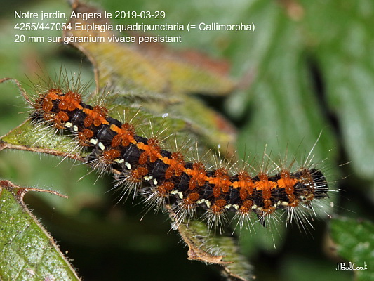 EREBIDAE, Arctiinae, Arctiini, Euplagia quadripunctaria (Poda, 1761) (= Callimorpha)_4255/447054 chenille de l'Ecaille Chinée_Notre jardin, Angers le 2019-03-29 (20 mm sur géranium vivace persistant)_Ident : JPC