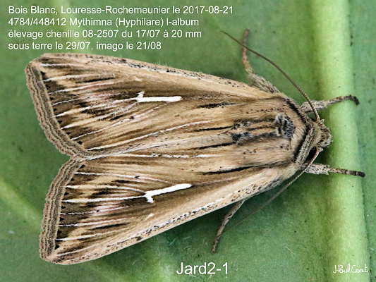 NOCTUIDAE, Noctuinae, Leucaniini, Mythimna (Hyphilare) l-album (Linnaeus, 1767)_4784/448412 le Crochet blanc, le L blanc_Bois Blanc, Louresse-Rochemeunier le 2017-08-21 (chenille de ponte 08-2507 du 17/07 à 20 mm, sous terre le 29/07, imago le 21/08)_Ident JPC Jard2-1