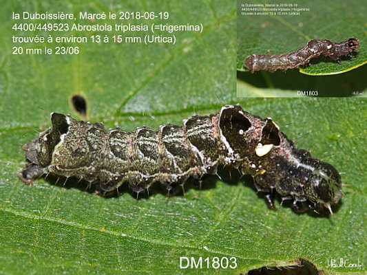 NOCTUIDAE, Plusiinae, Abrostolini, Abrostola triplasia (Linnaeus, 1758) (=trigemina)_4400/449523 chenille de la Plusie à lunettes (Urtica)_la Duboissière, Marcé le 2018-06-19 (trouvée à environ 13 à 15 mm, 20 mm le 23/06)_Ident : JPC DM1803